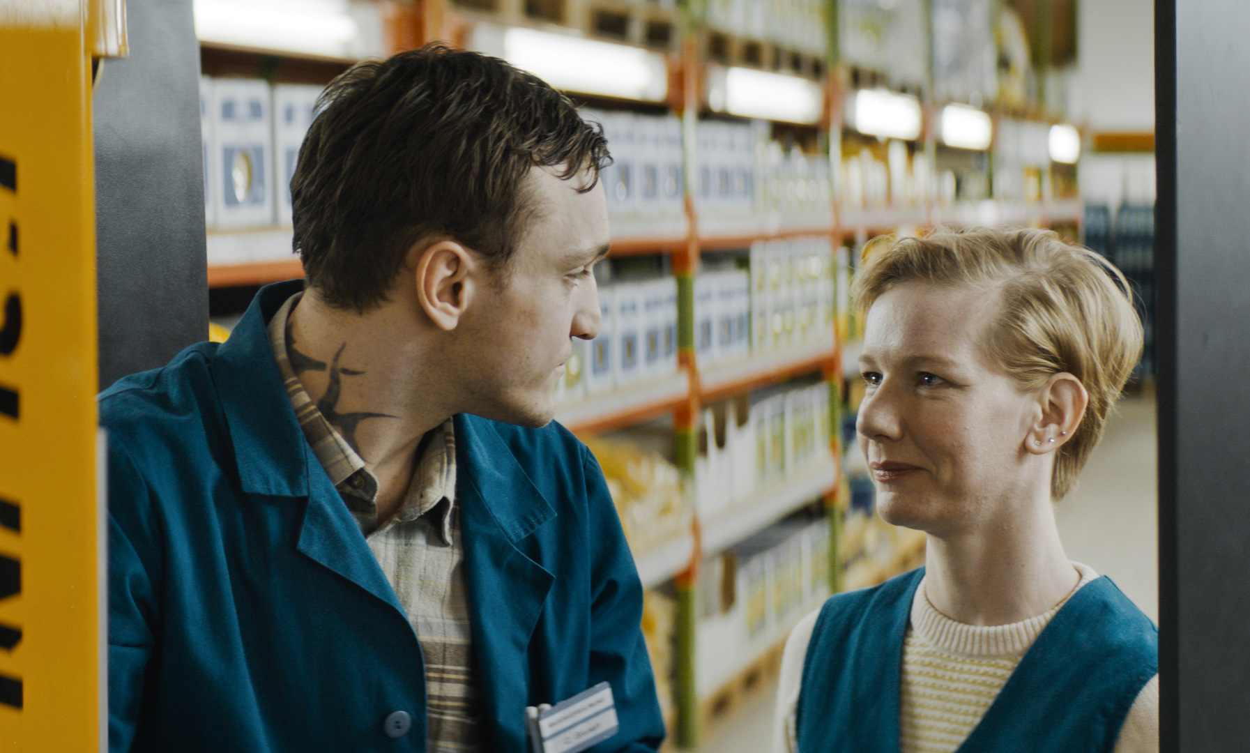 Christiana se ujímá veterán Bruno a zasvěcuje ho do mikrokosmu, v němž se žije podle specifických pravidel a ve svérázných bublinách jednotlivých oddělení. Při jedné z pauz potkává Christian prostořekou a okouzlující Marion z oddělení lahůdek. Láska mezi regály je křehká, civilní a realistická romance z místa, kde není vidět na nebe...